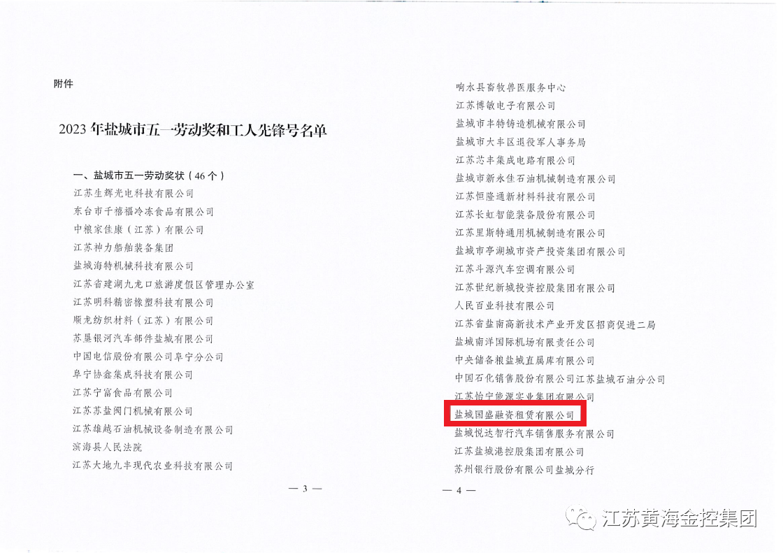 4月25日,盐城市总工会印发《关于授予2023年盐城市五一劳动奖和工人先锋号的通知》,对2022年以来涌现出的先进集体和先进个人进行表彰,老虎机必赢国盛公司荣获“2023年盐城市五一劳动奖状”。