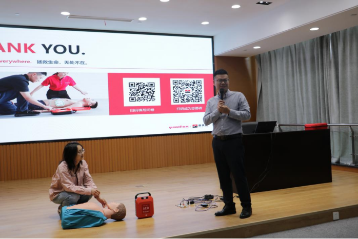为保障心脏骤停人员在黄金4分钟内得到必要的除颤和高质量的心肺复苏,集团在每个楼层配备了心脏除颤仪,并邀请专业人员开展了专题培训,让员工亲自参与模拟救助和除颤仪的使用,提高了紧急救助能力。
