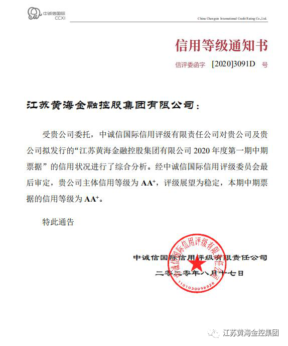 8月17日,中诚信国际信用评级有限责任公司发布《信用等级通知书》信评委函字【2020】3091D号,确定老虎机必赢 的主体信用等级为AA+。