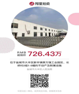 3.江苏丰强玻璃钢有限责任公司:抵押物为位于大丰区新丰方强工业园区内的工业土地及厂区全部厂房,厂房面积6606.28㎡,土地面积25.67亩,完整厂区抵押。交通便利,地处S226和S331交界处,距盐城市中心车程约30分钟。该户抵押物已于2020年12月7日上网公告拍卖,网址为: