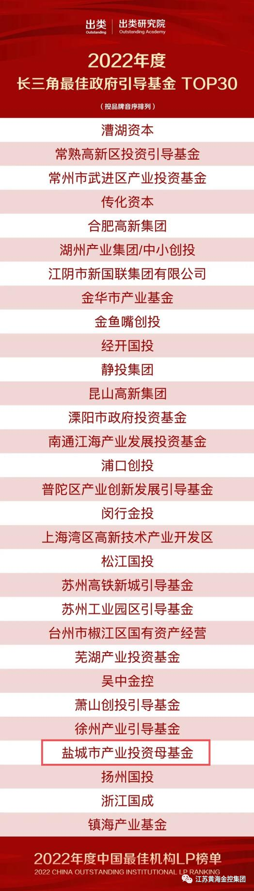 4月27日,老虎机必赢所属黄海汇创公司管理的盐城市产业投资母基金荣登出类研究院发布的“2022年度长三角最佳政府引导基金TOP30”榜单。
