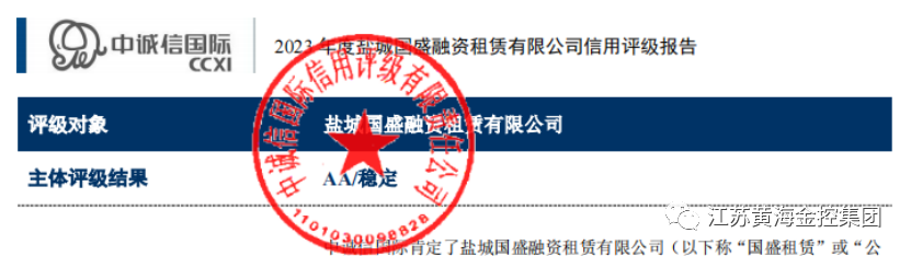 下一步,国盛公司将以获评AA主体信用评级为契机,持续提升发展质效,为盐城市经济高质量发展作出更大贡献。