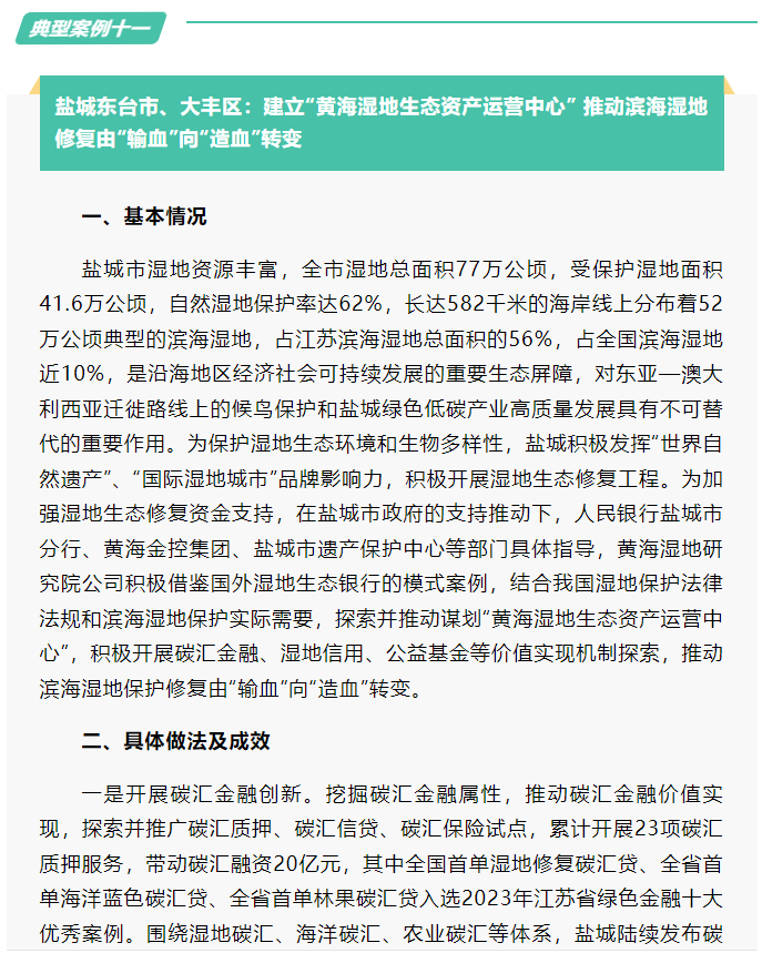 8月15日至16日,在全国生态日期间,江苏省发展和改革委员会发布江苏省生态产品价值实现机制典型案例,其中由集团和人民银行盐城分行支持的“黄海湿地生态资产运营中心”项目成功入选。